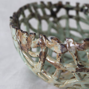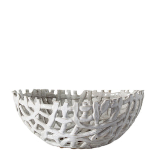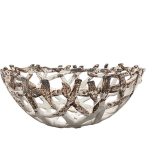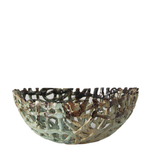 The earthy lattice of this bowl-shaped sculpture is reminiscent of roots or vines. Use it to hold fruit, dinner rolls, or in a place of distinction on a bookshelf.