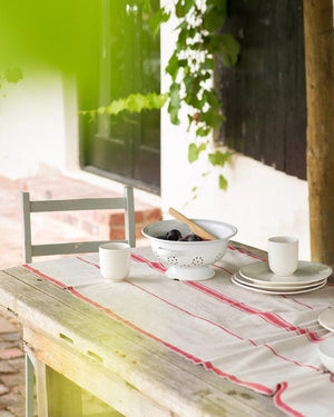 The Lisburn Linen fabric is inspired by antique french sacking material. The natural base color is accentuated with a colorful stripe detail that runs the length of the runner. In 19th century France, grain sacks were often hand woven and homespun out of a thick, durable fibre like linen or hemp. The addition of woven-in colored stripes played a significant role – different colors represented the contents of the sack, whilst the stripe designs helped farmers identify their own sacks after the chaos of a market, ensuring the rightful owners transported their sacks back to the farm or mill.