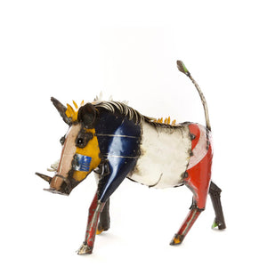 Metal sculptors transform used oil drums into vibrant patchwork wart hog sculptures. Each sculpture is finished with varnish to protect against the elements.